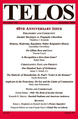 With this issue, Telos marks forty years as an independent journal of critical thought. Founded amidst the events of 1968, Telos has remained true to its origins, maintaining a tradition of independent thinking, while also evolving through the change of four decades. What began as an effort to think philosophically about the political questions of the day continues with the same agenda: our reflections on various thinkers—to take examples from this issue: Alasdair MacIntyre, Walter Benjamin, Gillian Rose, or G. K. Chesterton—are not driven by antiquarianism or academic intellectual history. Rather, we have culled through philosophical traditions, modern and ancient, in order to address the changing character of society and the protean cultural expressions that have emerged from it. This constant redefinition of the critical project informs the teleology, a constant orientation toward the North Star of emancipation, as we navigate the shifting currents of circumstance.